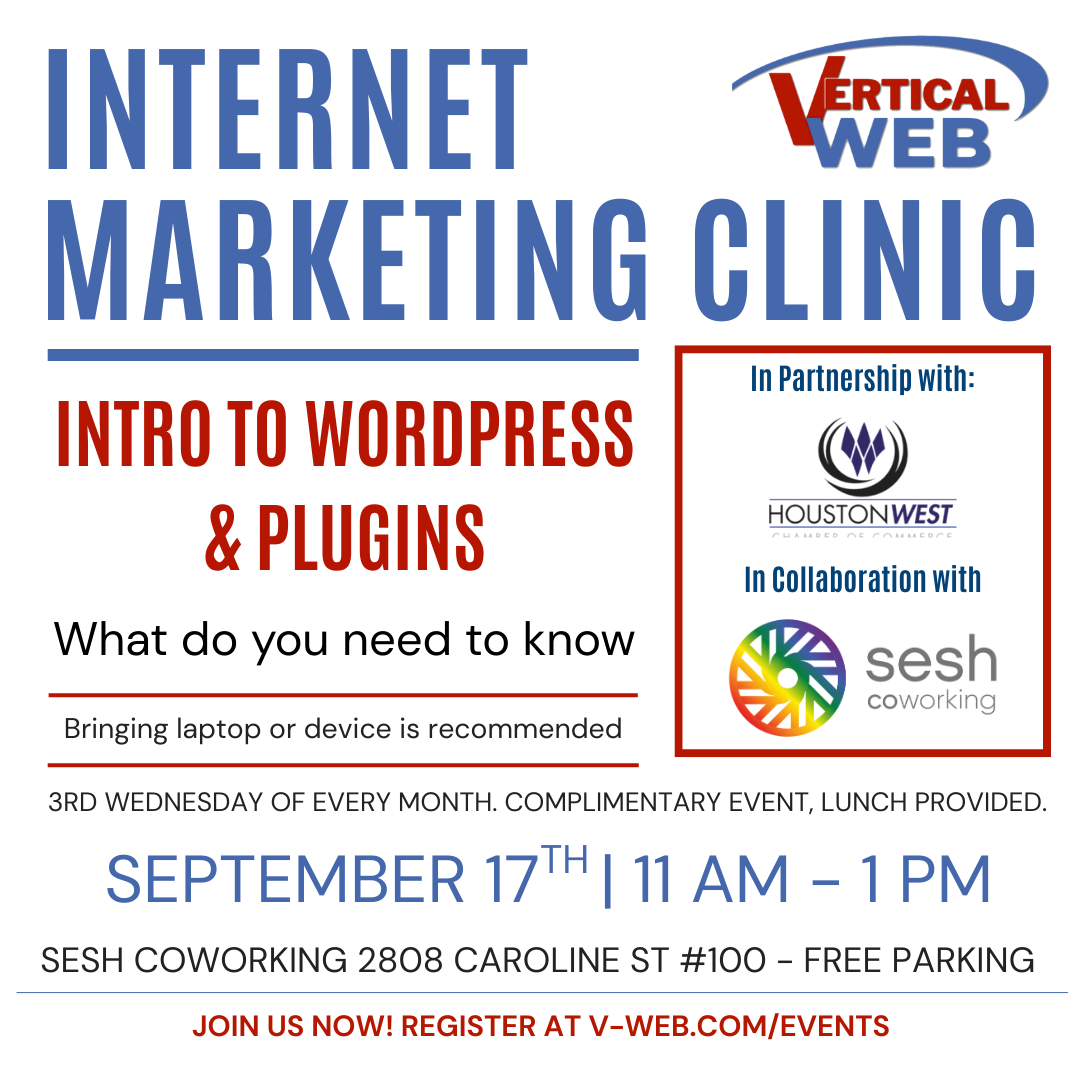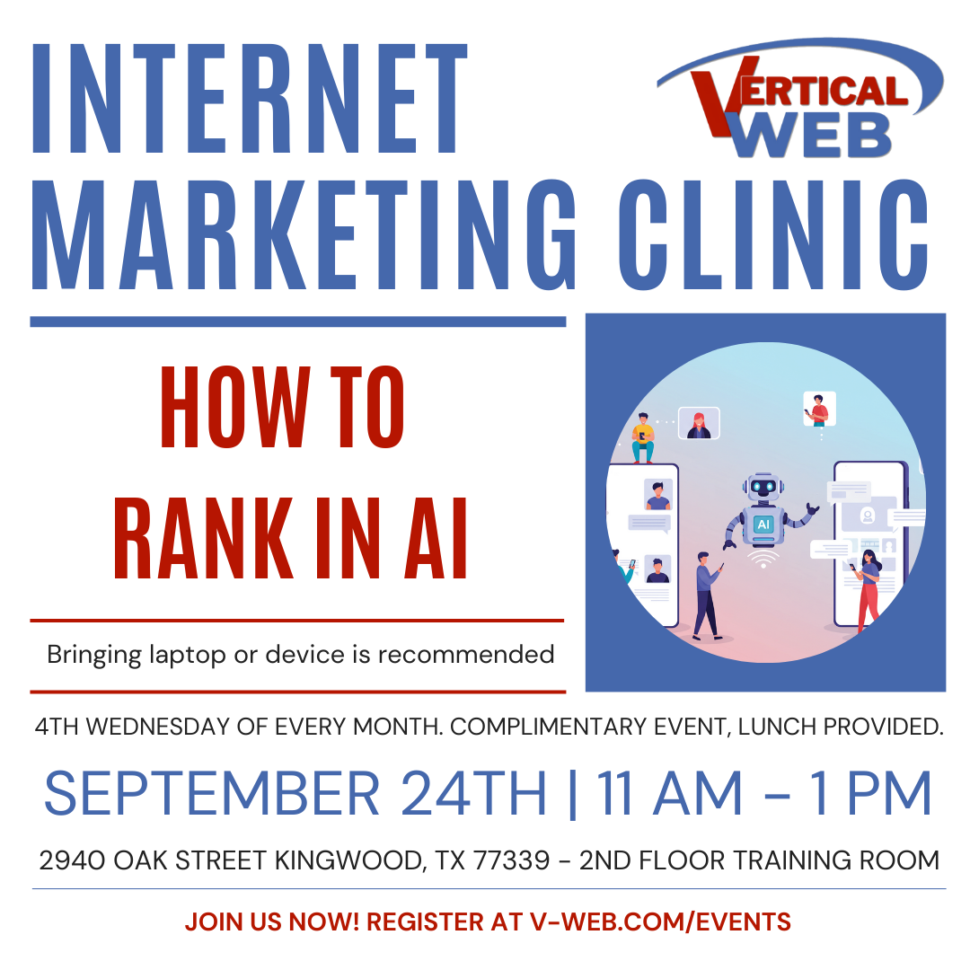 Wednesday, September 24th – In Person Kingwood/Greater East Montgomery County/Spring Register Today! Internet Marketing Minute NEW! We are excited to annouce that we are adding a daily marketing tip of the day. Join our Follow our TikTok or Instagram channels to get your daiy Internet Marketing Minute! TikTok Instagram Previous Internet Marketing Clinics