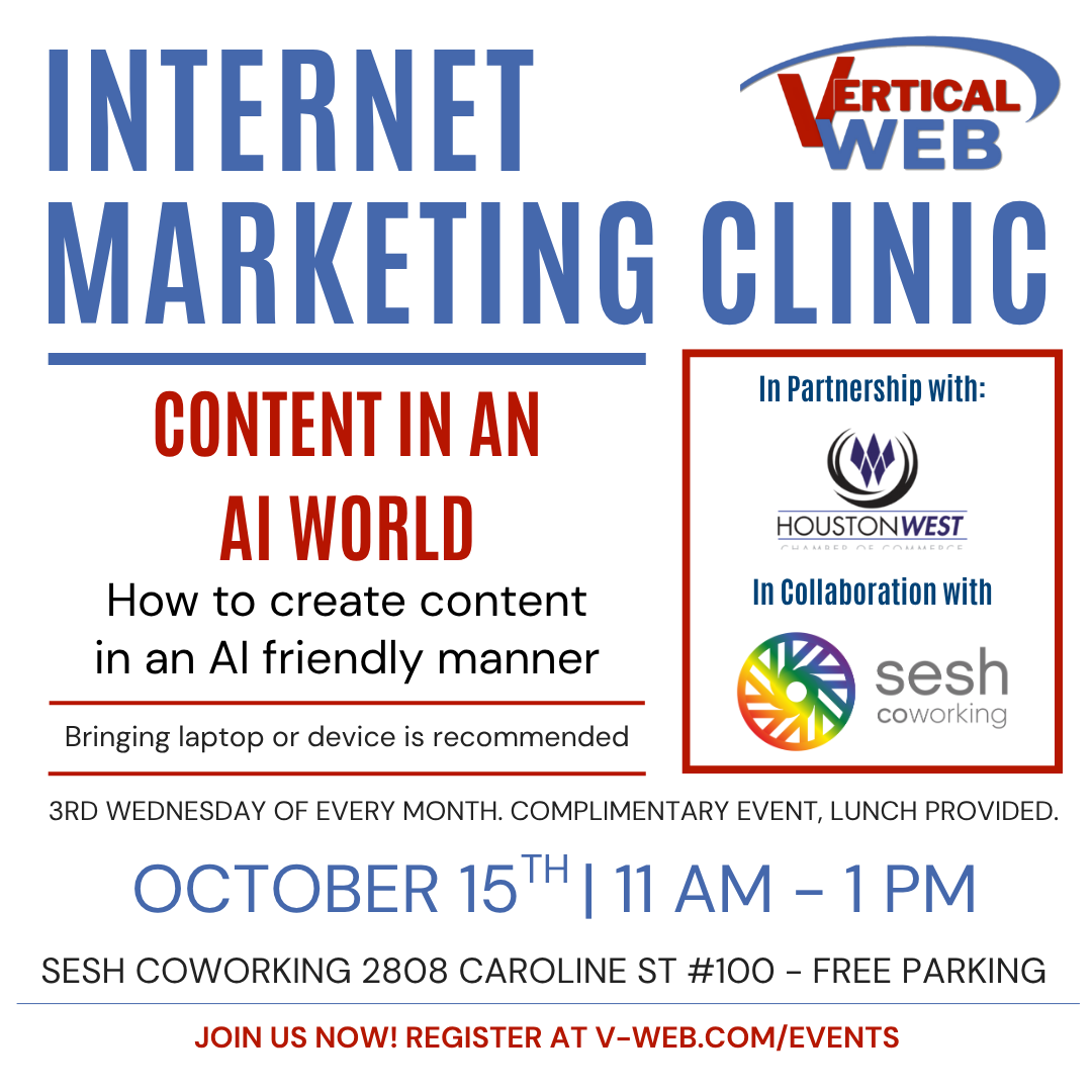 Wednesday, October 22nd – In Person Kingwood/Greater East Montgomery County/Spring Register Today! Internet Marketing Minute NEW! We are excited to annouce that we are adding a daily marketing tip of the day. Join our Follow our TikTok or Instagram channels to get your daiy Internet Marketing Minute! TikTok Instagram Previous Internet Marketing Clinics